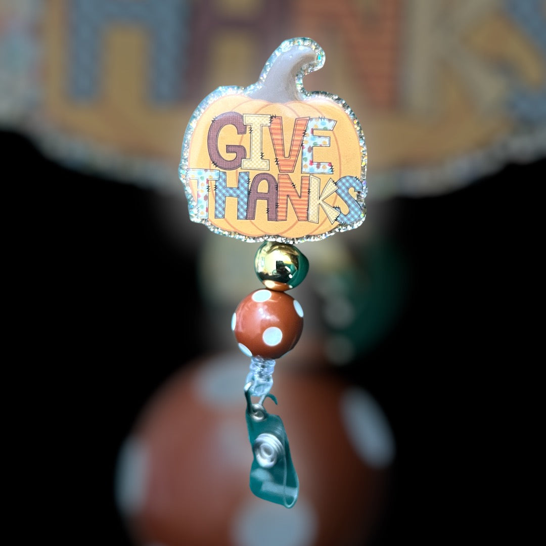 Featuring a charming pumpkin design and the heartfelt message ‘Give Thanks,’ this badge reel is the perfect accessory to add some autumn warmth to your daily routine.