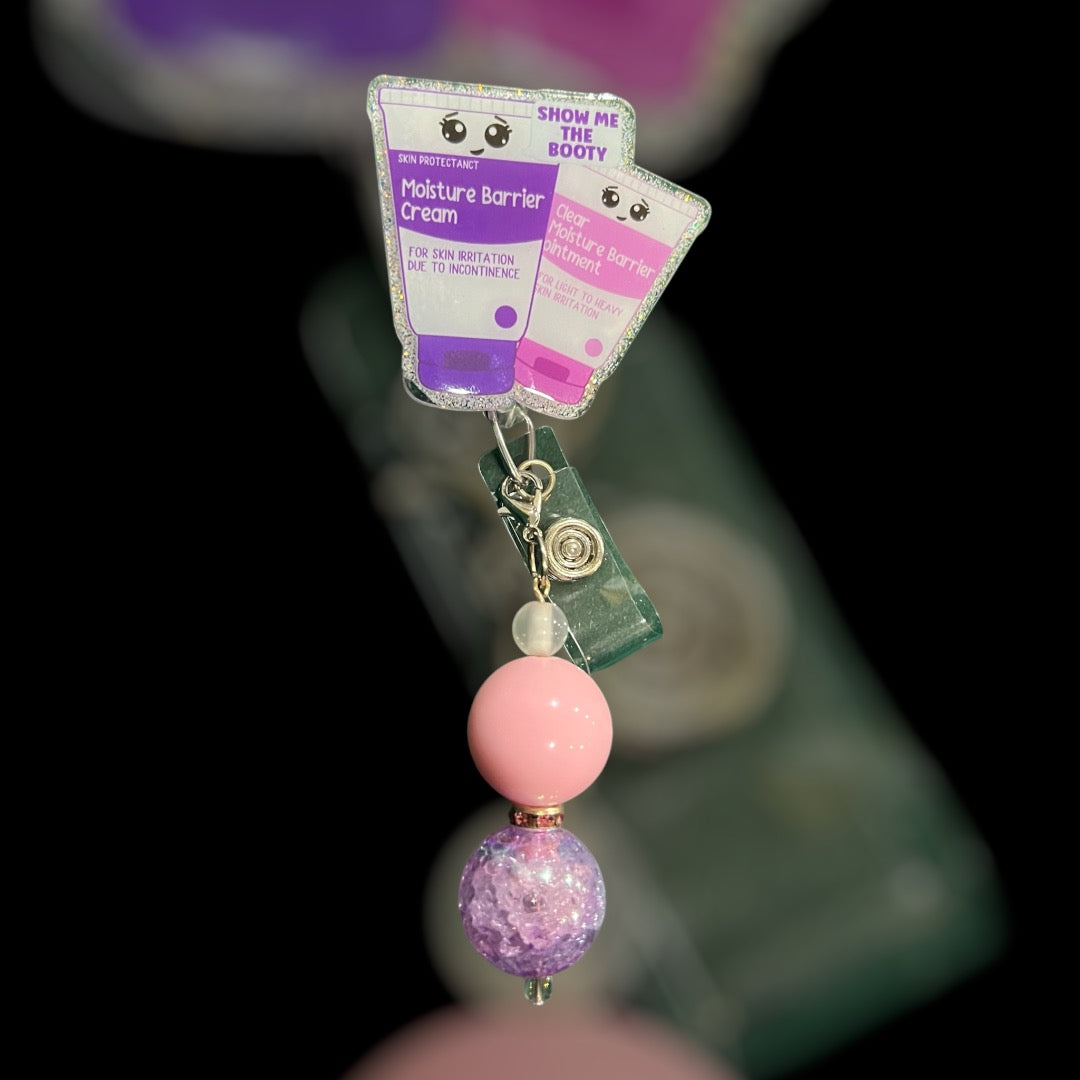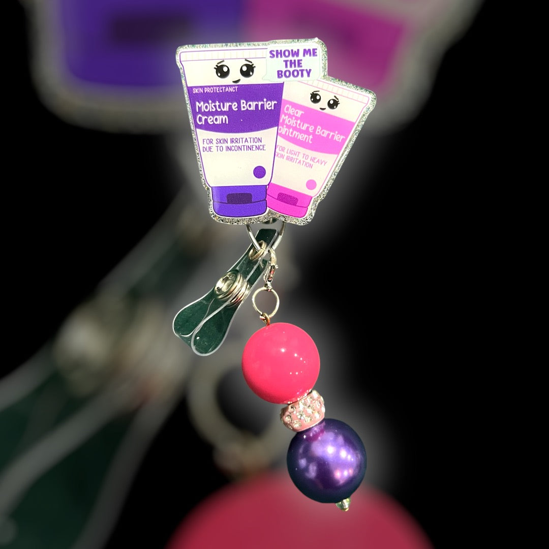 Designed specifically for those in healthcare and caregiving professions, this playful badge reel highlights the importance of moisture barrier cream while keeping your ID easily accessible.