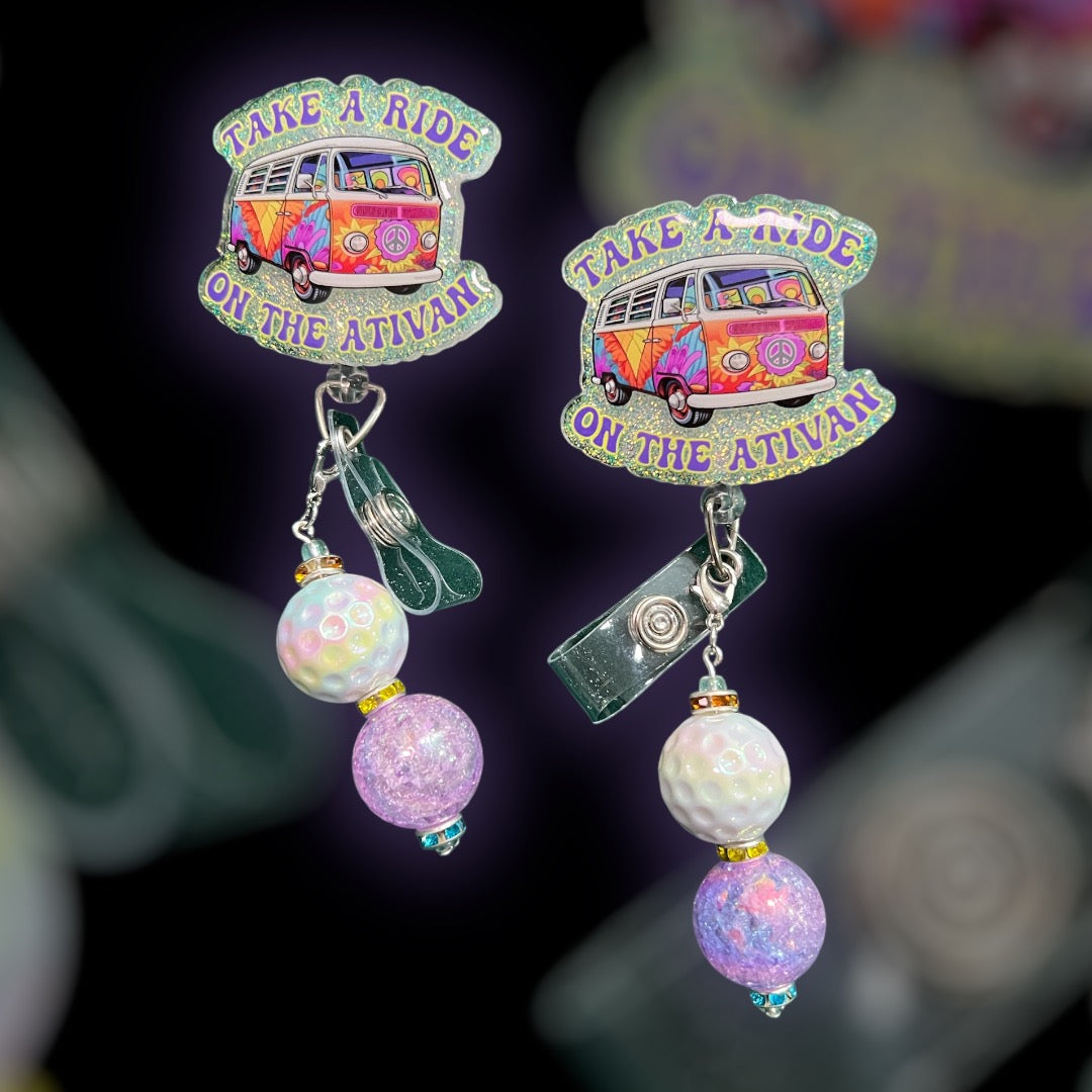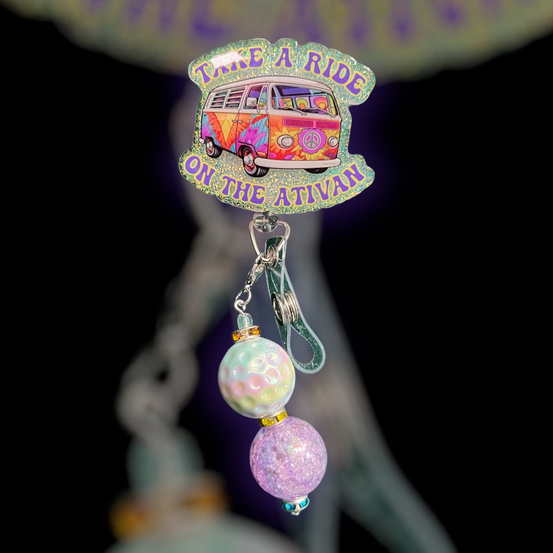 Take a groovy ride through your shift with this “Take a Ride on the Ativan” badge reel! Featuring a colorful, hippie-style van with a glittery finish, this retractable ID holder adds a touch of humor to your workday. Designed for nurses, healthcare workers, and mental health professionals who appreciate a little sarcasm, this badge reel comes with beautiful matching beads for extra flair.